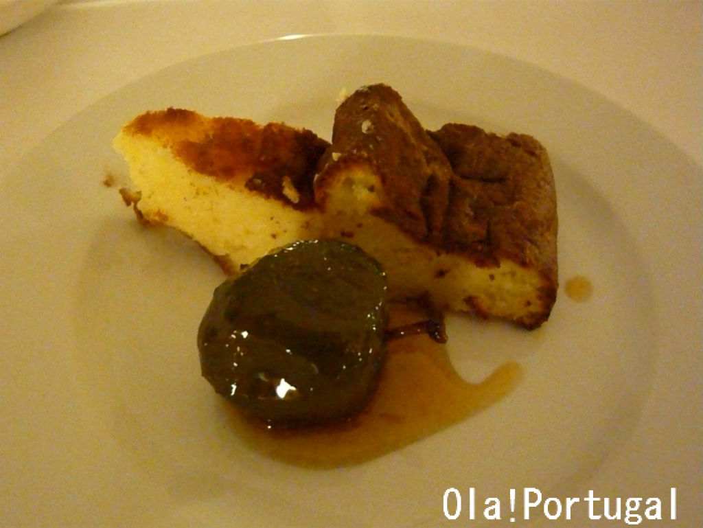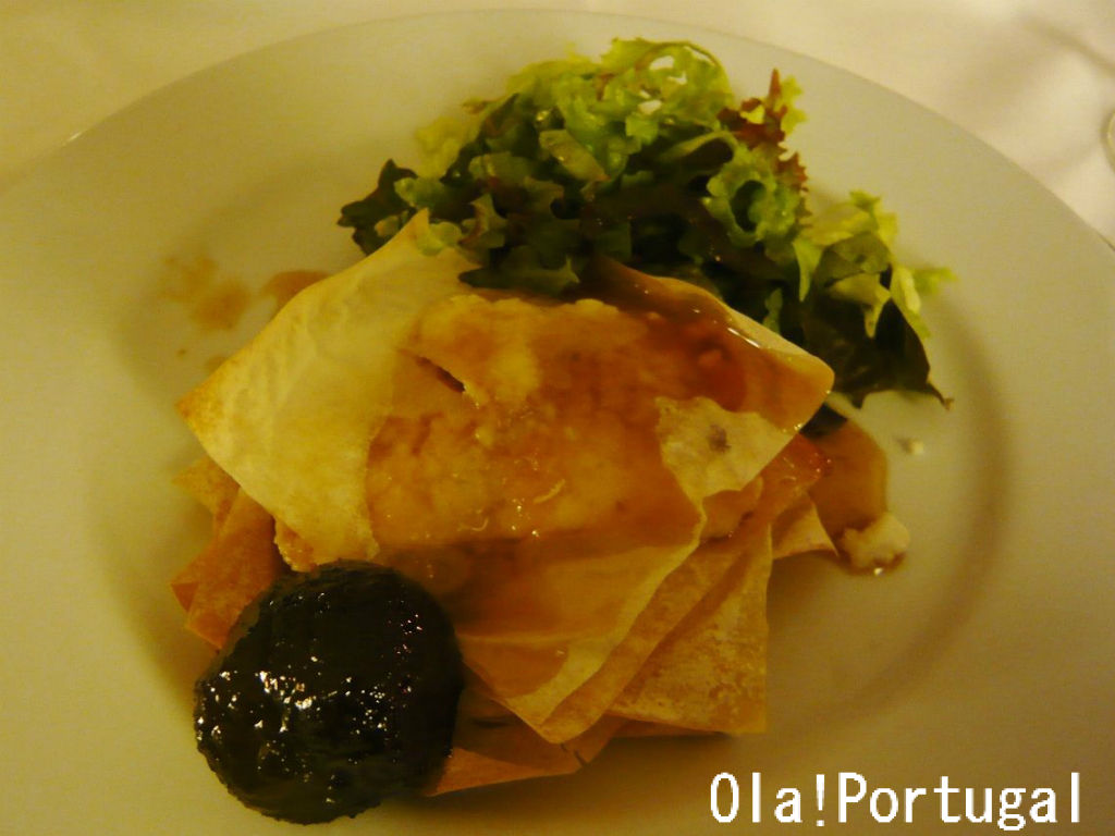 ポルトガルのフレッシュチーズ:リケイジャオンをMil-Folhas ミルフィーユの薄い生地に挟んだ前菜。Elvas エルヴァスはアレンテージョ地方東部の星形城塞都市。そのエルヴァスの銘菓がプラムのシロップ漬けです。