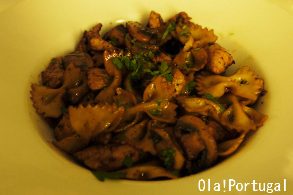 ケのチョイス。Peru ペルー(七面鳥)とCogumelo コグメロ(マッシュルーム)入りの、Farfalle ファルファッレ(蝶リボン状のショートパスタ)の温サラダ。まぁ、注文した時には七面鳥の料理位にしか分かっていなかったんだけど。