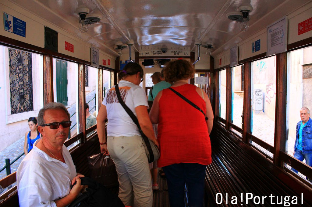 真ん中で、もう一台のケーブルカーとすれ違います。向こうの車両からの観光客の方が身を乗り出して写真を撮っていますね。やはりリスボン観光で人気の乗り物です。それにしても、この落書き・・・。喝だ、喝!!