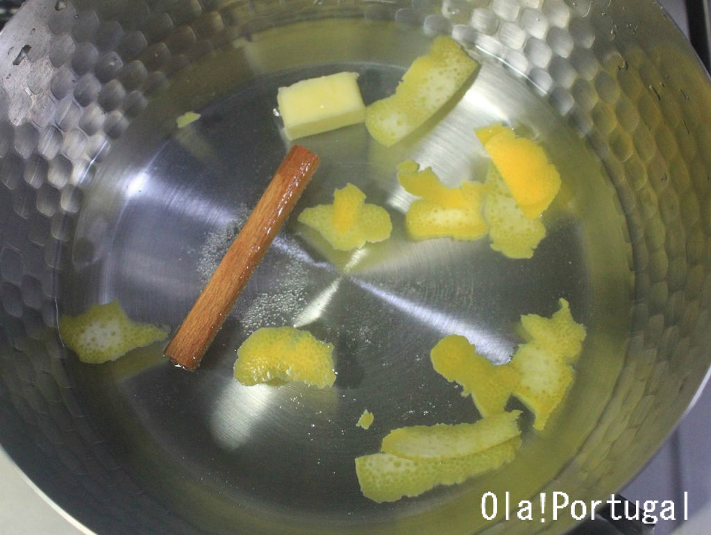 鍋に、お水、レモンの皮、バター、塩、シナモンスティックを入れて中火で煮立たせます。