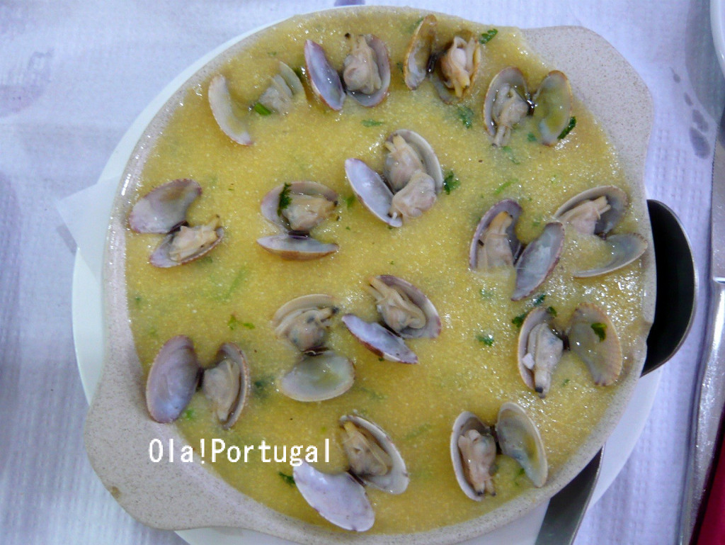 はい、こちらがケが食べたかったファーロのあるアルガルヴェ地方の郷土料理、シャーレン・コン・アメイジョアス。シャーレンは貝の汁で出汁をとったスープにトウモロコシの粉で練った、お粥みたいな料理です。それにアメイジョアス(アサリ)が表面に散らされていました。この料理、他の地方だと、ほとんど見かけないんですよね。今回旅したアルガルヴェ地方一皿、まるまるシャーレンなので、途中で飽きるかな?と思っていたのですが、あっさりとした出汁が美味しく、トウモロコシの粒粒感もいい感じで完食しました。