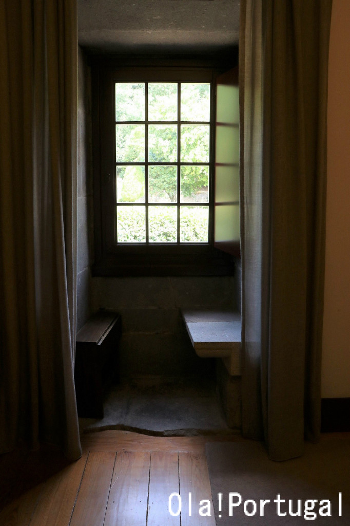 部屋の窓。窓の所に石造りの椅子による瞑想スペースがあって、この雰囲気好き。ここのポザーダの中庭や庭園は美しいので、のんびりと過ごすのにぴったりの空間です。